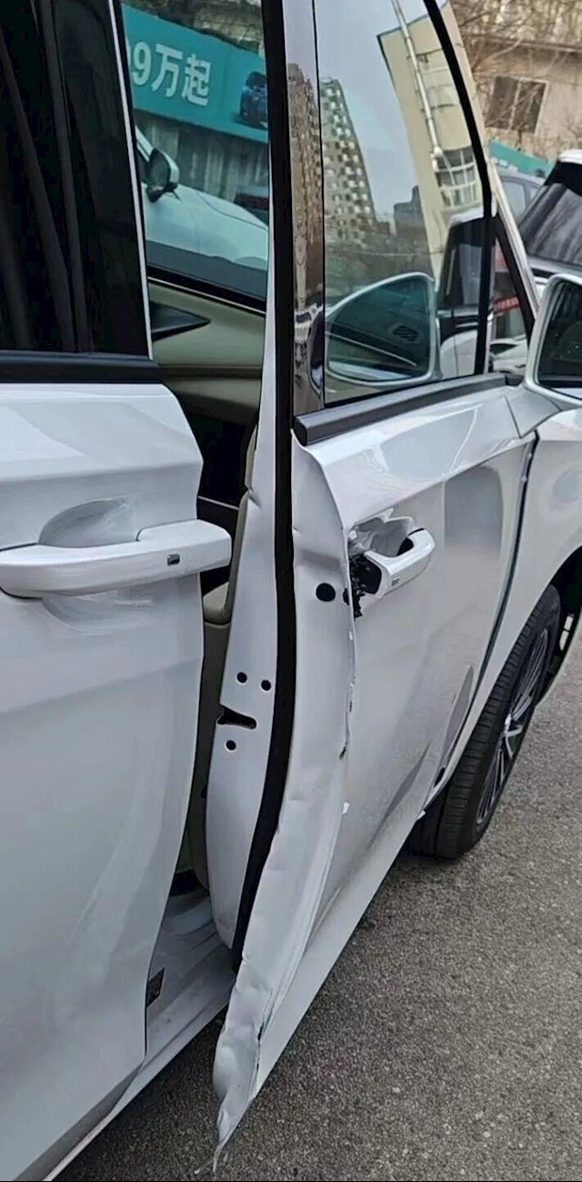 期间,该店销售员坐在车辆副驾驶位进行讲解,指导结束后转身开门下车时,后方驶来的车辆撞上了刚打开的车门致车门受损,此时,李先生的新车仅行驶了41公里。