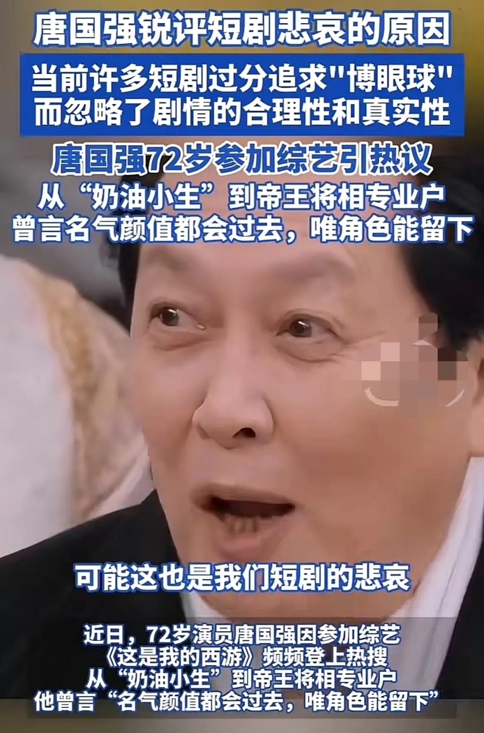 确实,唐国强曾在综艺中直言不讳地痛批短剧“博眼球、忽略真实性、合理性”,如今却也改变态度、参与其中。