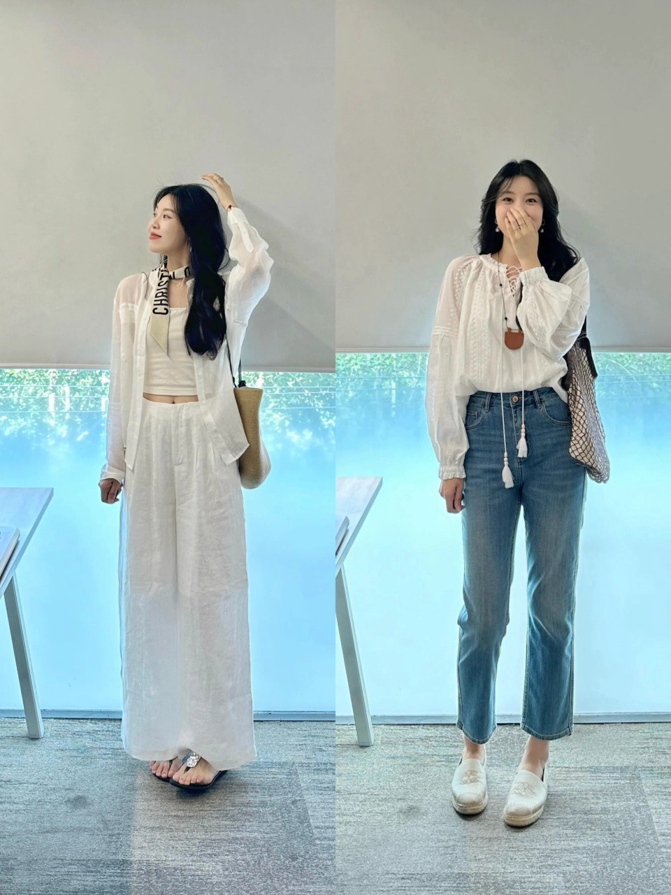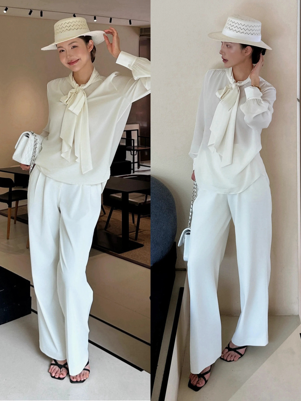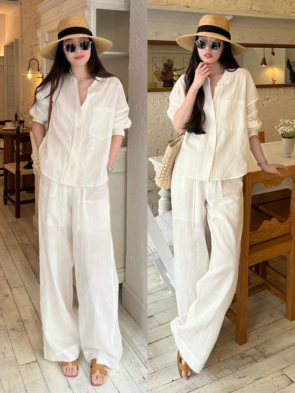 Tips①:棉麻白衬衫+白色直筒阔腿裤