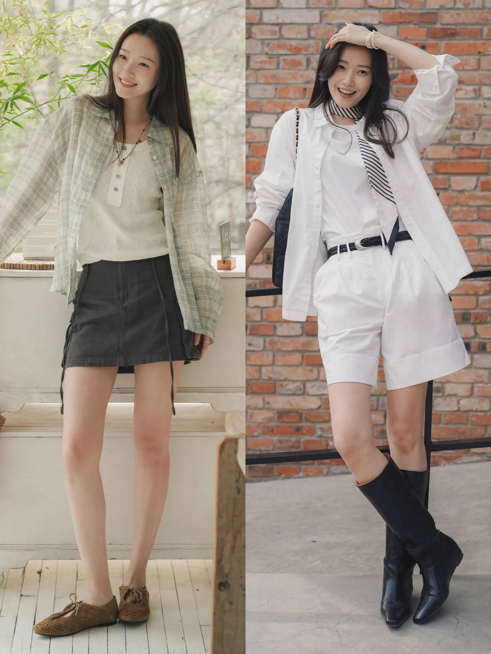 换成灰色短裙,配上格纹的衬衫,叠穿一件白色的针织开衫,既温柔又有活力感。