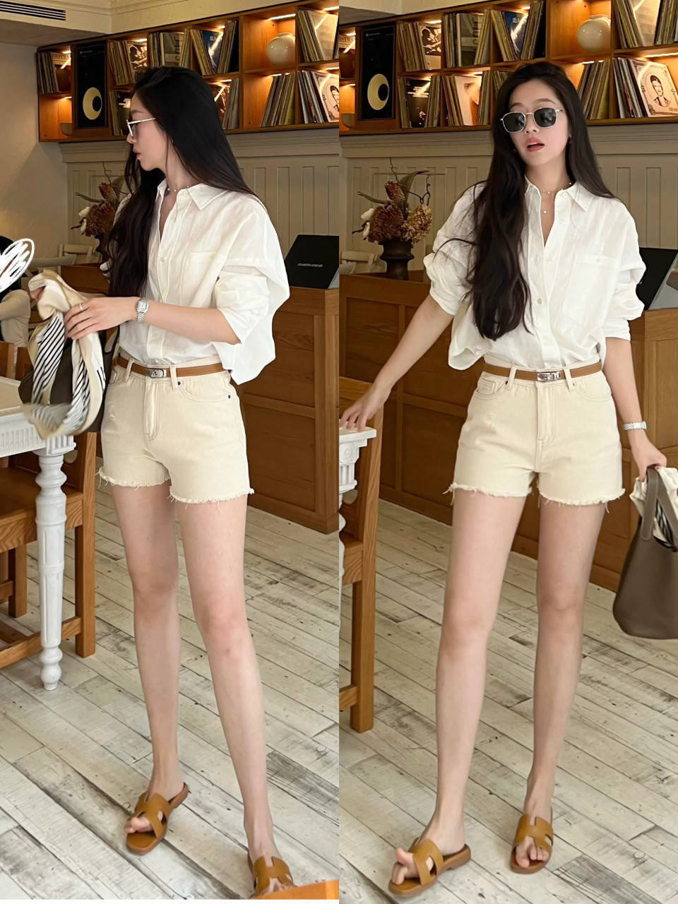 若拥有修长笔直的大长腿和高挑身材,可选一件白色衬衫搭配卡其色短裤,脚踩一双。美拉德色系的拖鞋,尽显精致感。