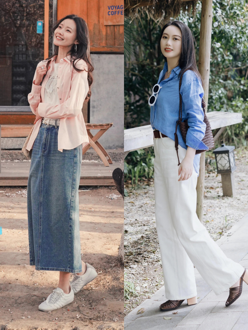 同样是穿衬衫,但是下装不同,选择的鞋子自然有差异。选择一条蓝色的牛仔直筒半裙配上粉色的衬衫,这时候你想要呈现少女气息,不妨直接选择小白鞋来穿搭,增加造型的运动元素,活力感满满。