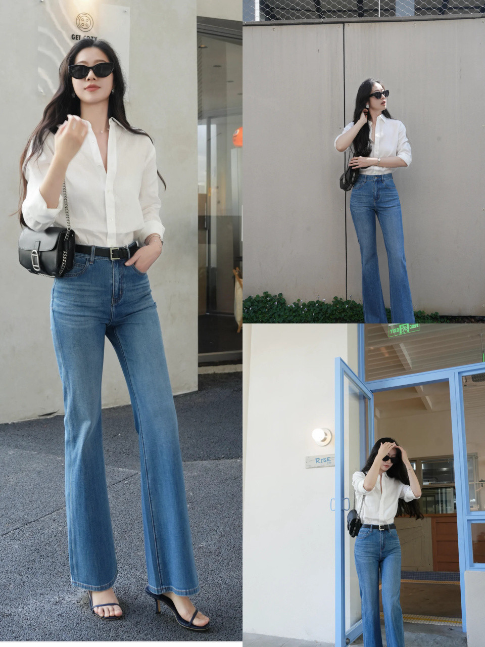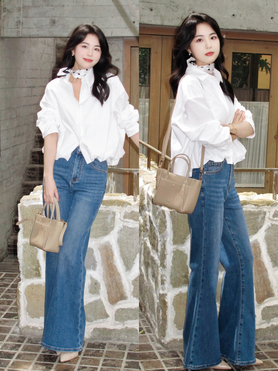 例如上面这一套穿衣打扮,用白色的小众衬衫搭配上蓝色的牛仔微喇叭阔腿裤,脚踩一双浅口的跟单鞋,自带清爽干练气场,还能延伸腿部线条,让穿搭者拥有大长腿,同时自然修饰出三七分的身材比例。