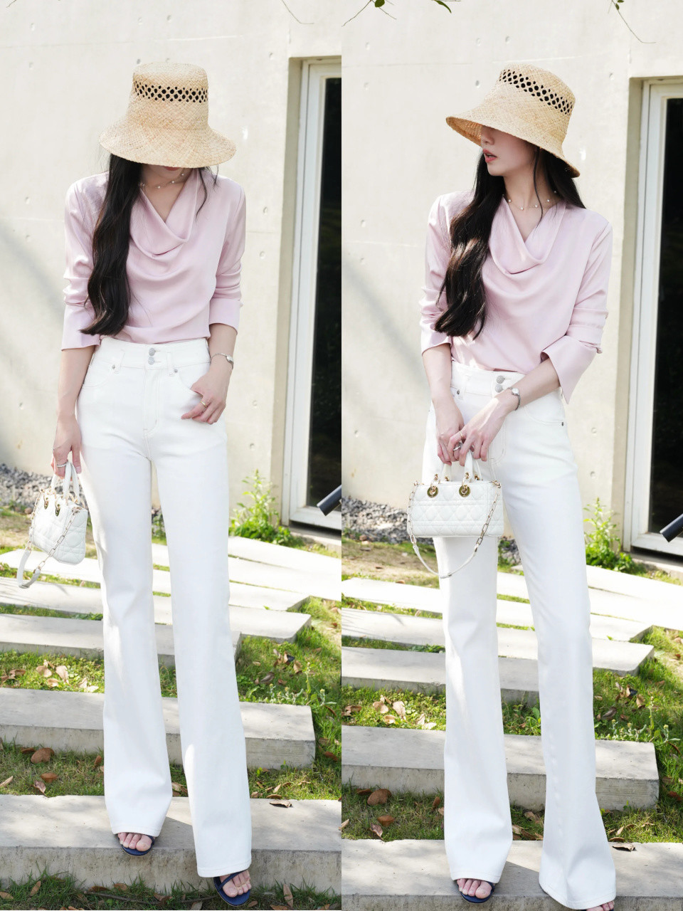 或者我们选择一件粉色的小众衬衫,搭配白色的微喇叭直筒裤,脚踩一双黑色凉鞋,头戴草帽,氛围感拉满,不用刻意装嫩,自然呈现年轻姿态。