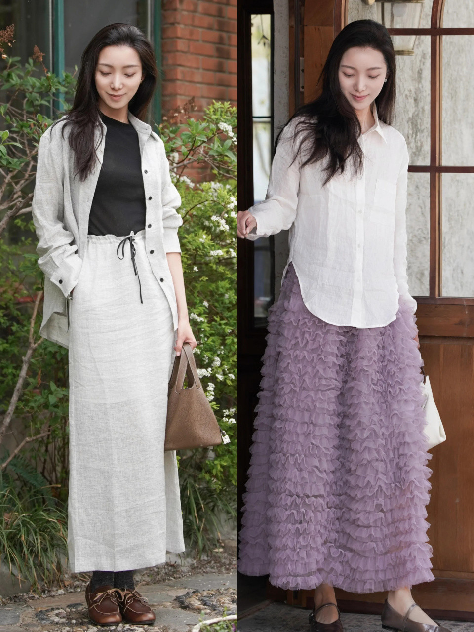 换成微宽松的白色棉麻衬衫,搭配上紫色的木耳边 A 字半身裙,脚踩玛丽珍鞋,这一身穿衣打扮既温柔又时髦高级,日常通勤约会都能轻松驾驭,或是出门旅游拍照都适配。