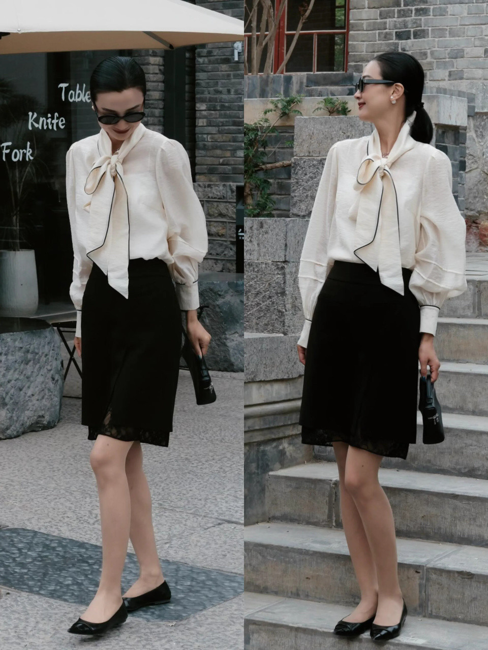 Tips③:雪纺衬衫搭配白色西装裤,利落又温柔