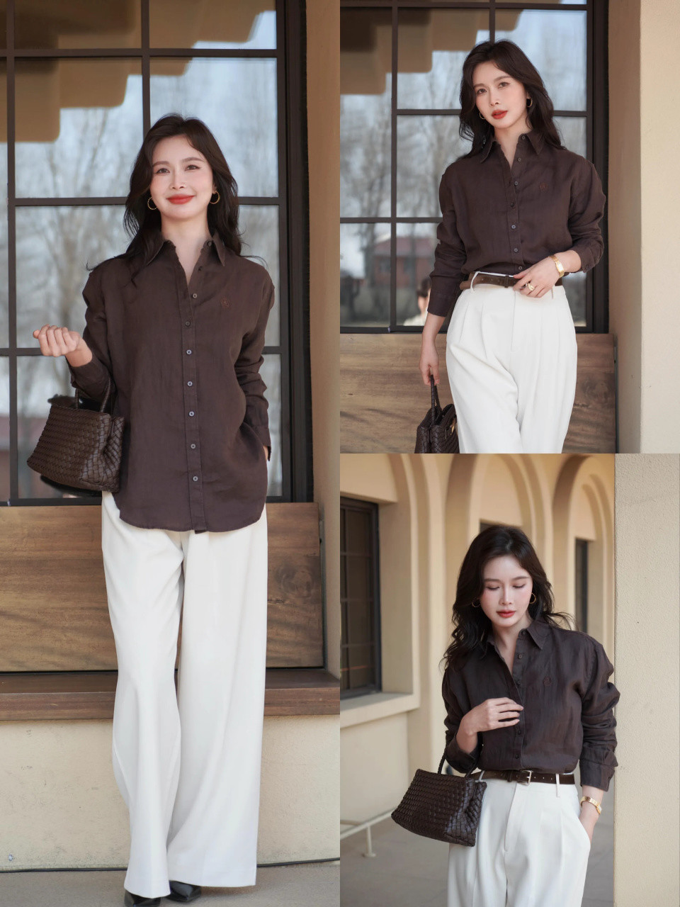 例如,上面用棕色的皮鞋配上白色的阔腿裤和浅灰色的小众衬衫上衣,既清爽又显得高级。