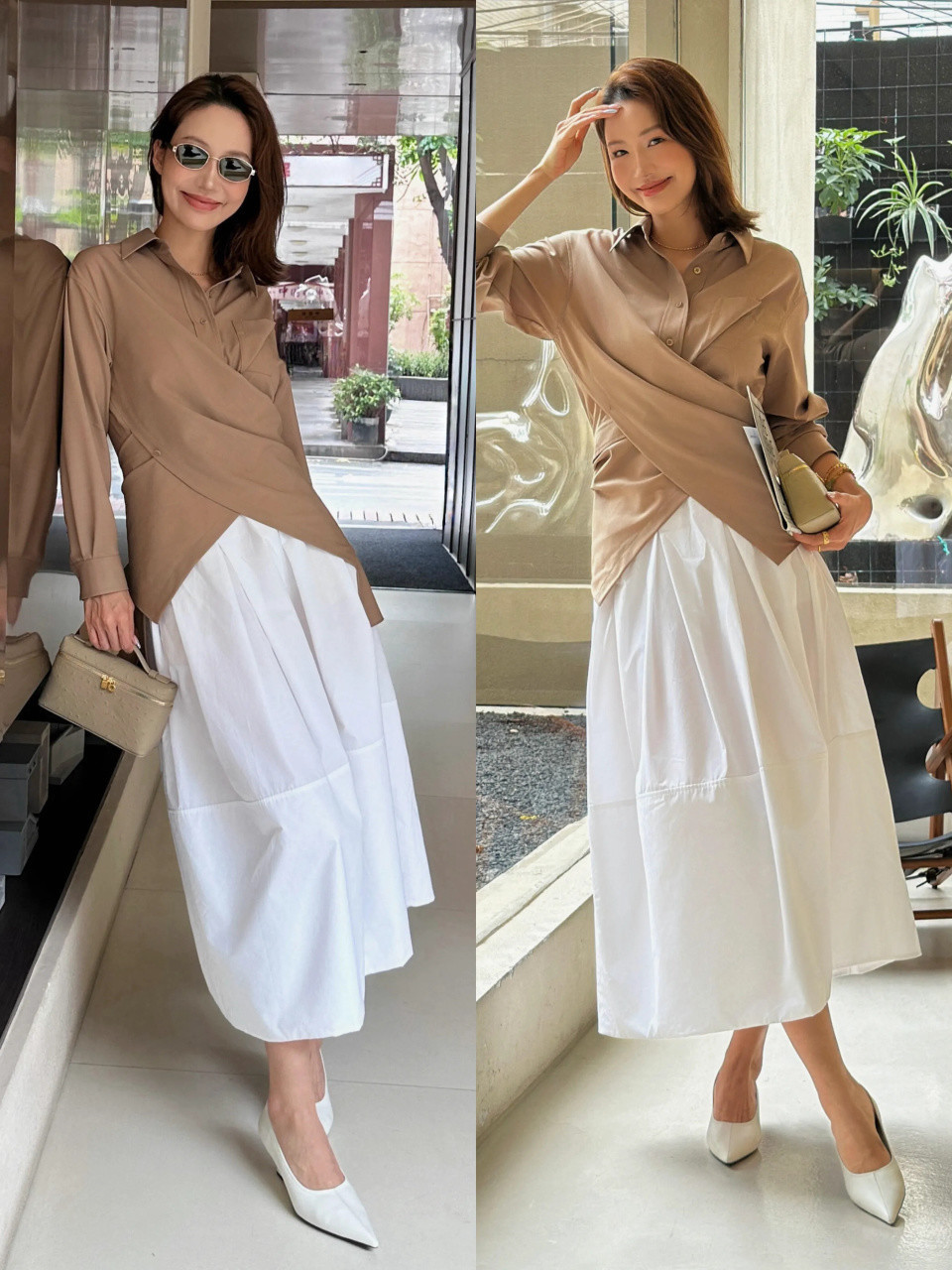 top③:卡其色衬衫+白色半身裙